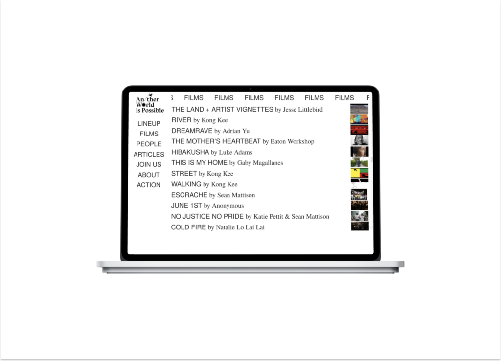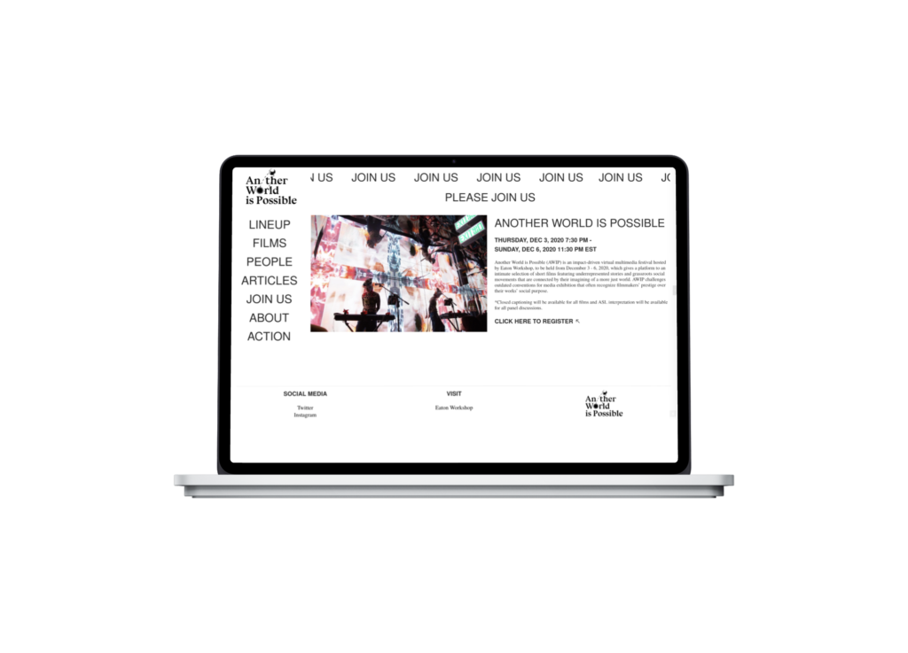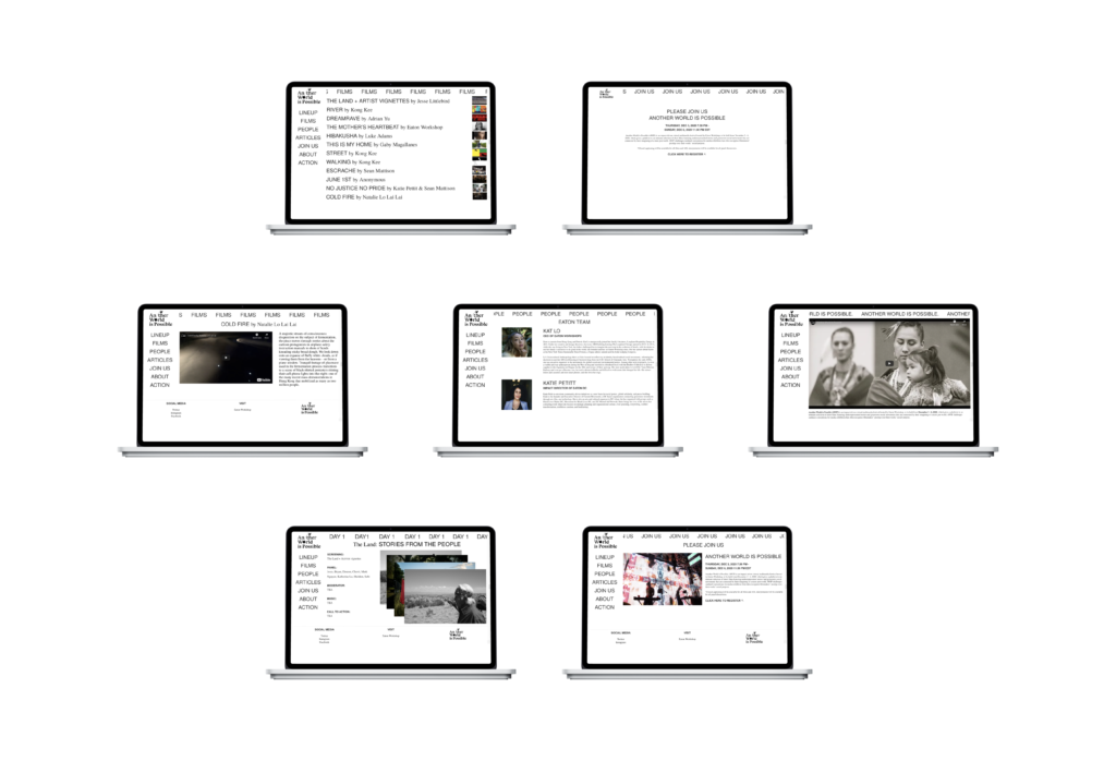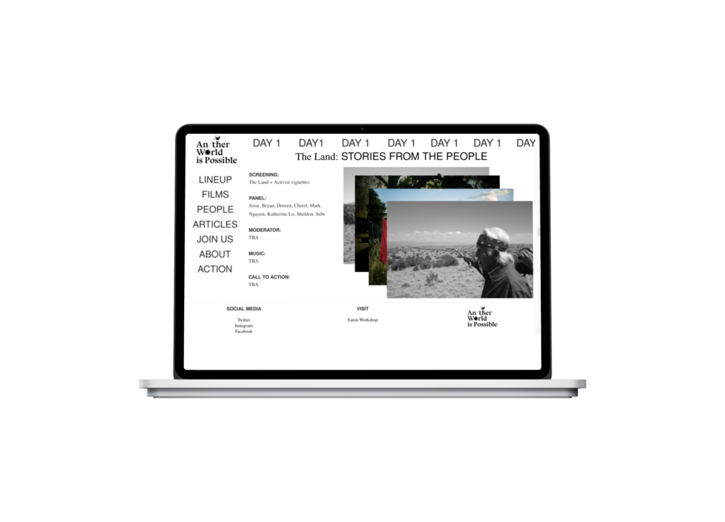A website design for Another World Is Possible, a film festival hosted by Eaton DC, a hotel and cultural space known for its focus on activism, media, and community programming. The project organizes films, talks, and related content into a clear and accessible digital structure, supporting the festival’s emphasis on storytelling and social change.