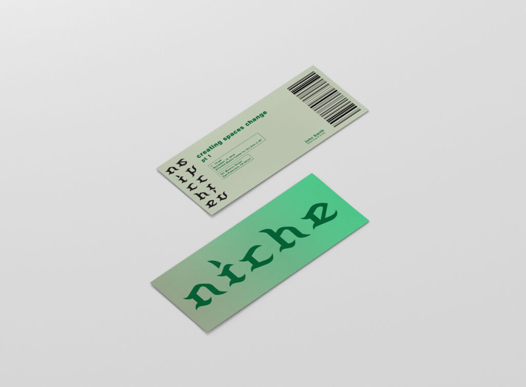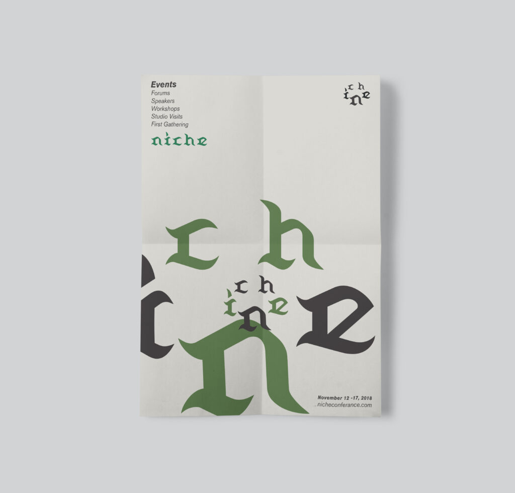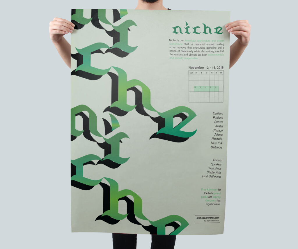 Branding and poster design for Niche, an imagined architecture and design conference centered on community-driven urban spaces. The identity combines blackletter-inspired typography with layered, modular forms to evoke structure, gathering, and spatial relationships. The work explores how visual systems can reflect the ways people occupy and shape shared environments, positioning the conference as a space for dialogue around design, ecology, and collective experience.