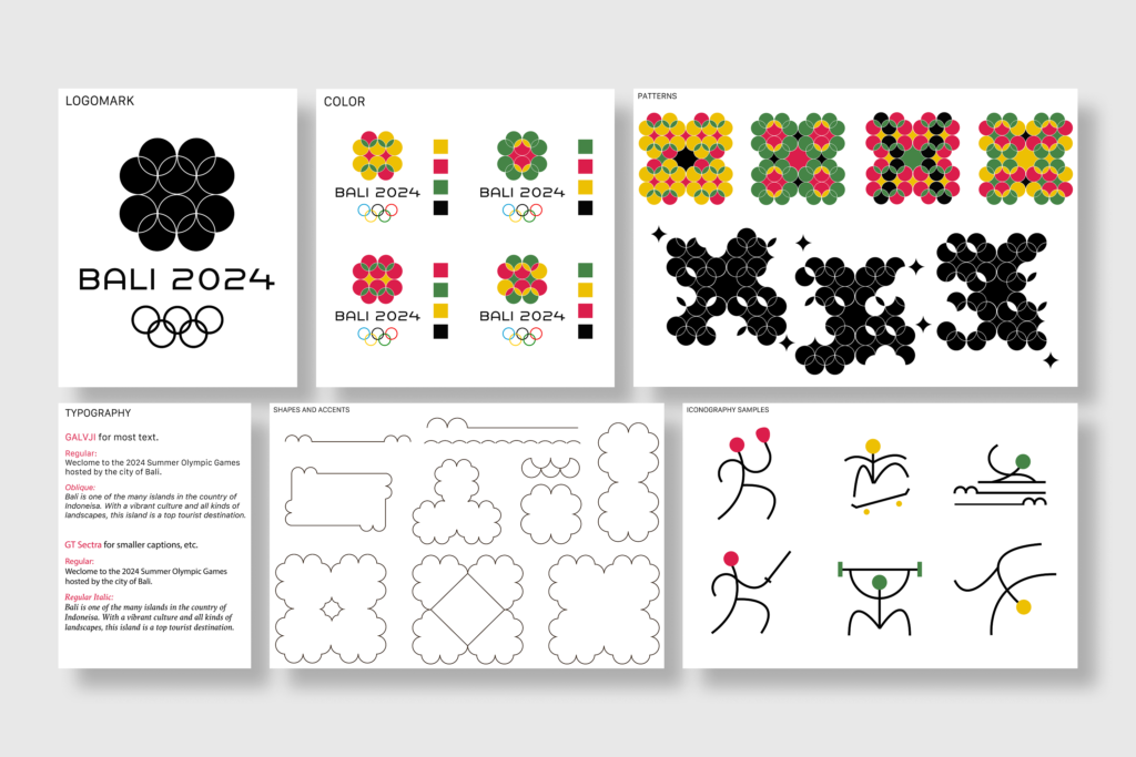developed a speculative branding system for the 2024 Olympics in Bali, centered around a modular logomark built from repeating circular forms. The structure draws from both the geometry of the Olympic rings and patterns found in Balinese visual culture, creating a flexible identity that can expand, contract, and reconfigure across applications.
