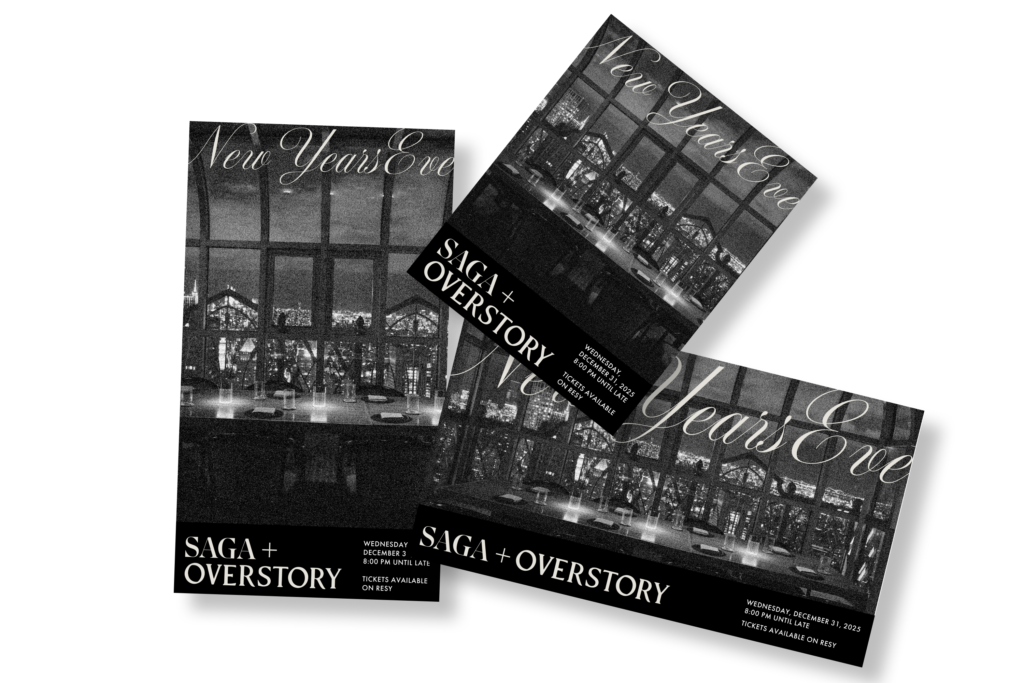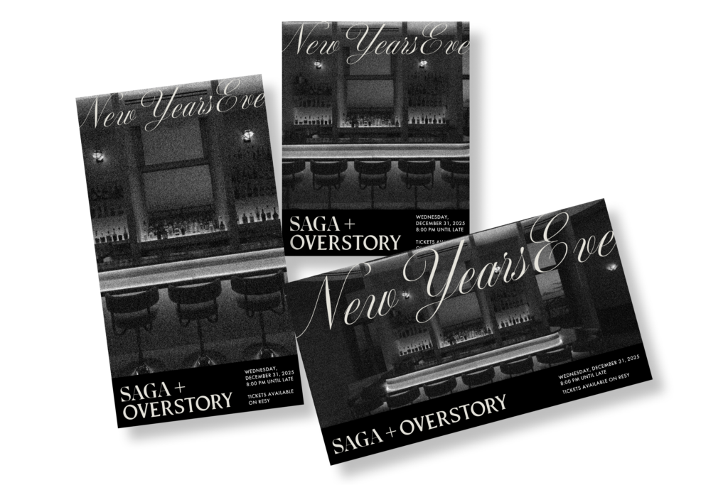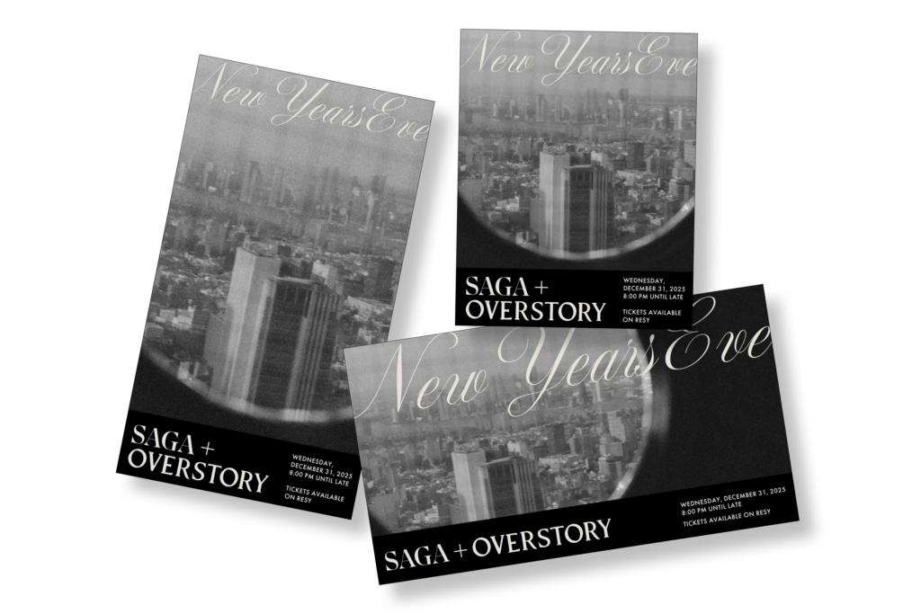 I designed a series of social media graphics for New Year’s Eve at Saga and Overstory, focusing on capturing the atmosphere of the space through a restrained, cinematic approach. I used black-and-white imagery to highlight the architecture and skyline views, creating a sense of mood and anticipation while keeping the visuals cohesive across posts. The tone reflects Saga’s two Michelin stars, balancing promotion with a sense of refinement and exclusivity.
