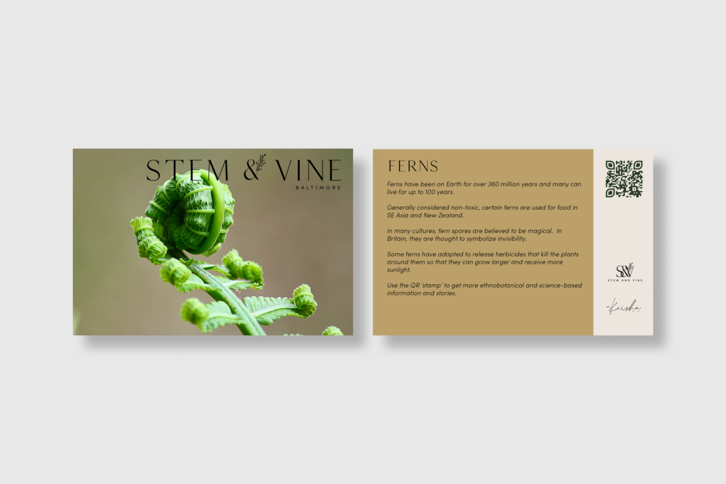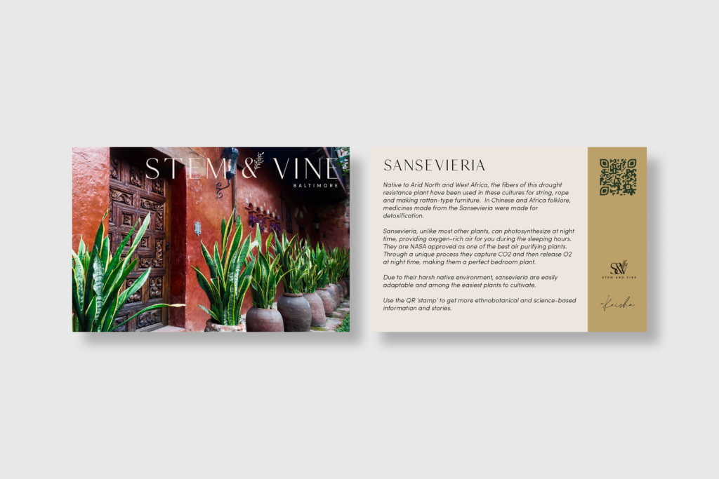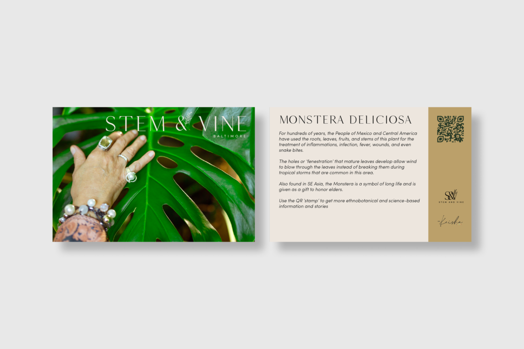 I designed a series of educational postcards for Stem & Vine, a Black-owned plant shop and community space in Baltimore, focused on making plant care approachable and engaging. Each card pairs close-up photography with clear, concise information, creating a balance between visual appeal and practical use.