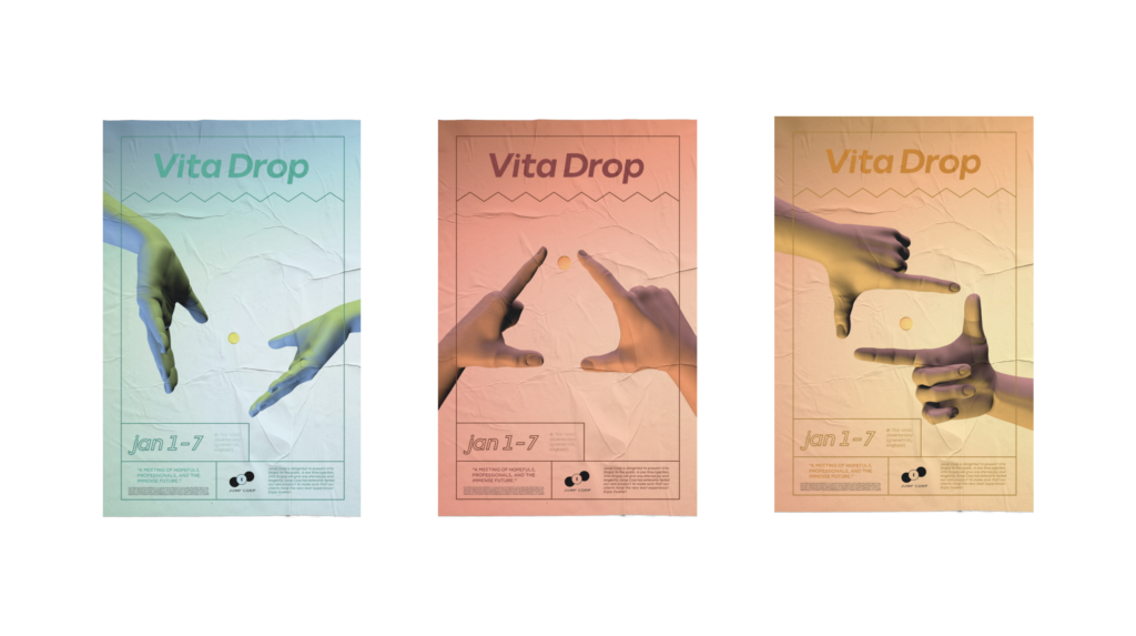A series of posters and motion assets for Vita Drop, an imagined festival centered around a speculative drug promising immortality. The project explores how wellness, technology, and desire are packaged and circulated through contemporary visual culture. Across three posters, repeated gestures and a central “drop” element create a simple visual system that shifts through color and composition.